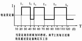 - 热积累功能:一般的电子式保护器是靠RC充放电来完成过流动作时间的,若遇电机在过流的设定点上下波动时,而且平均电流又超过了设定电流,一般保护器是很难实施保护,特别在反时限动作特性下,更难有效地保护电动机,如图十一所示例:t1~t2 、t3~t4 、t5~t6的每段过流时间都小于设定动作时间,无热积累的保护器是无法保护的,但(t1~t2)+(t3~t4)+(t5~t6)的累计过流时间已远远地超过过流设定动作时间。图十二表示该产品的热积累功能,当出现上述过流情况时,它是按(t1~t2)-(t2~t3)+(t3~t4)-(t4~t5)+(t5~t6)方式计算过流,当累计值满足设定值时,过流保护动作。在这t2~t3 、t4~t5时间段,我们且称它为热恢复期,只有热恢复期大于热积累值,保护器过流计时复位,再遇过流时才重新计时。这样可有效地防止电机负载波动烧毁电动机。